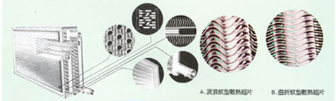 散熱翅片分為波浪型與曲折型兩種,高精度沖模經(jīng)二次翻邊沖制而成。接觸面積大,增強翅片強度,及空氣擾流效果,鋁材質(zhì)采用含鋁純度達(dá) 99.97% 左右,排管亦為高純度無縫紫銅管,純度 99% 以上,總體耐用持久,不易破裂腐蝕。 排管內(nèi)回路依設(shè)計流速需要,采用單、雙回流系統(tǒng),流體阻力降低,熱交換效果良好。 翅片與銅管經(jīng)本公司擁有獨特的超高壓( 1500-3000PSI )漲管系統(tǒng)和持久性定壓檢漏作業(yè),使其確保緊密結(jié)合,大大增強熱傳導(dǎo)效果;冷媒盤管并經(jīng)高溫加熱真空干燥作業(yè),確保腔內(nèi)無雜質(zhì)水分存在 集流管選用無縫鍍鋅鋼管規(guī)格,設(shè)計流路分配均勻壓降低,接管頭加裝有排水塞及排氣閥各一支。 盤管外框端板采用防銹鍍鋅鋼板制成,硬度高、強度足、壽命長、裝配組合容易作業(yè)。 | ||