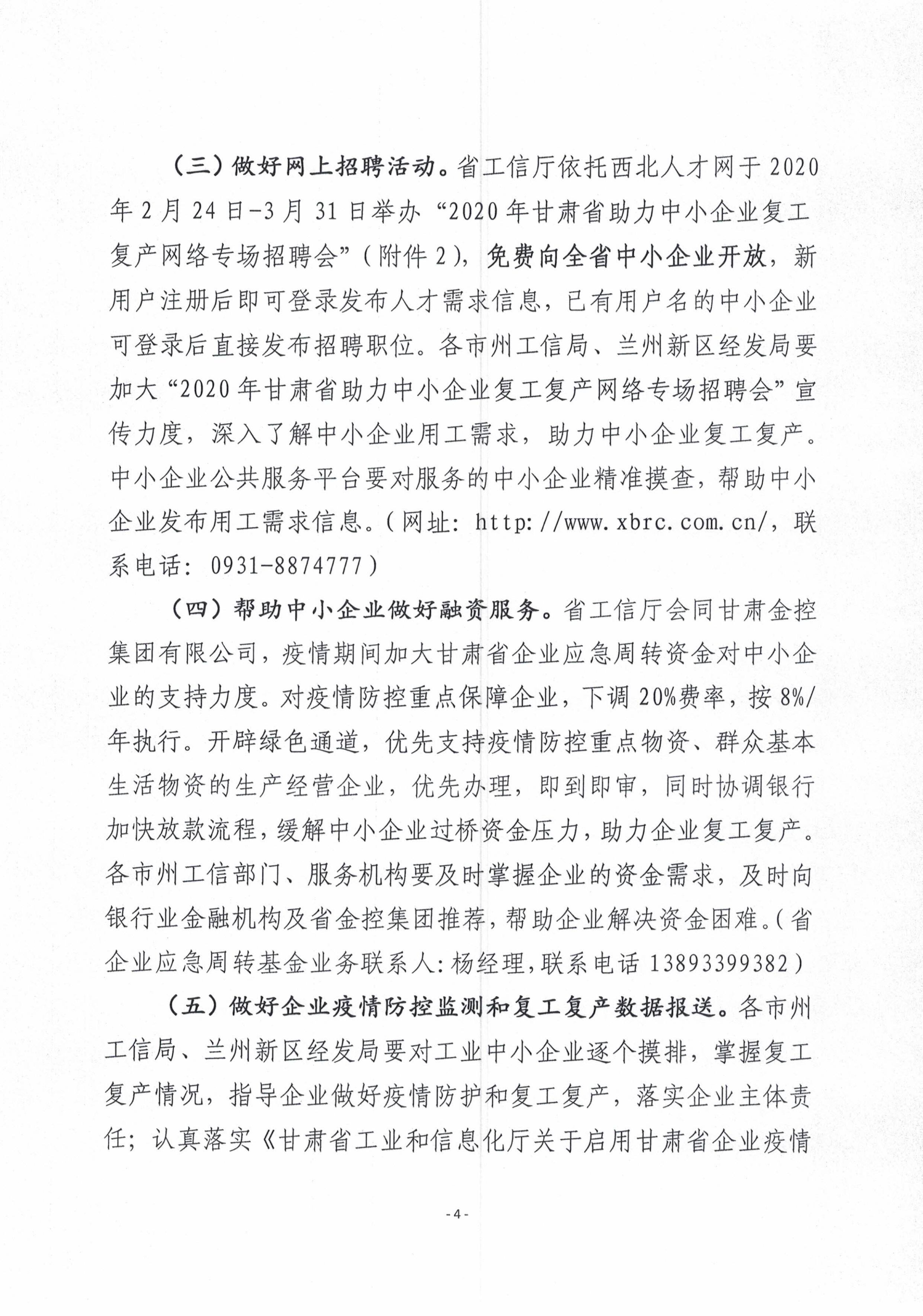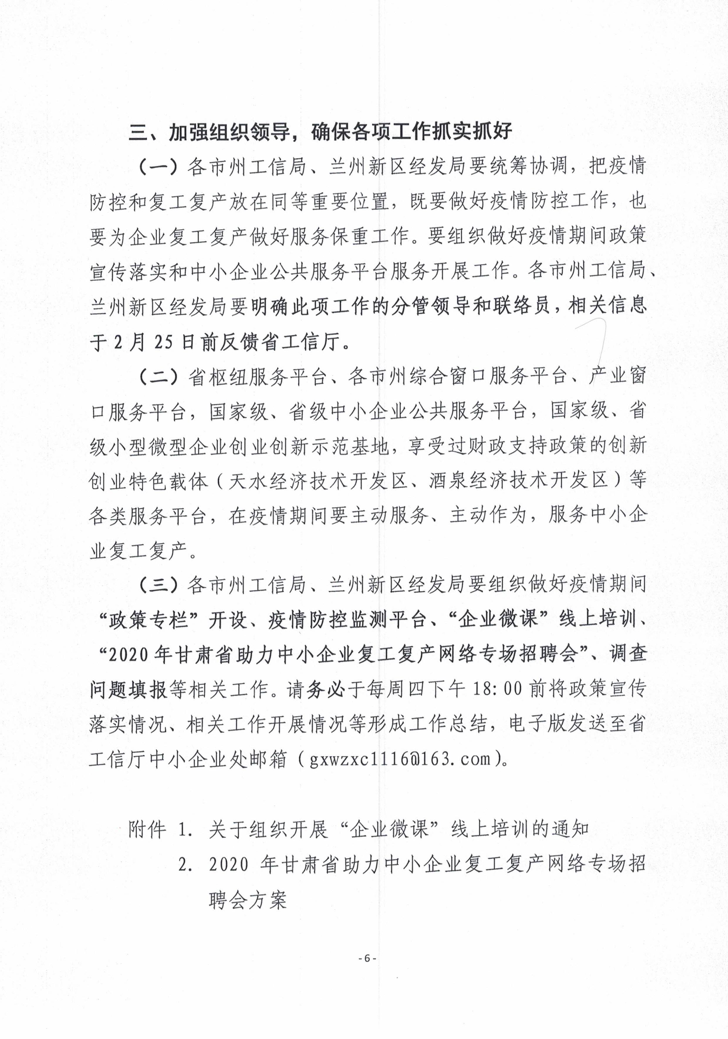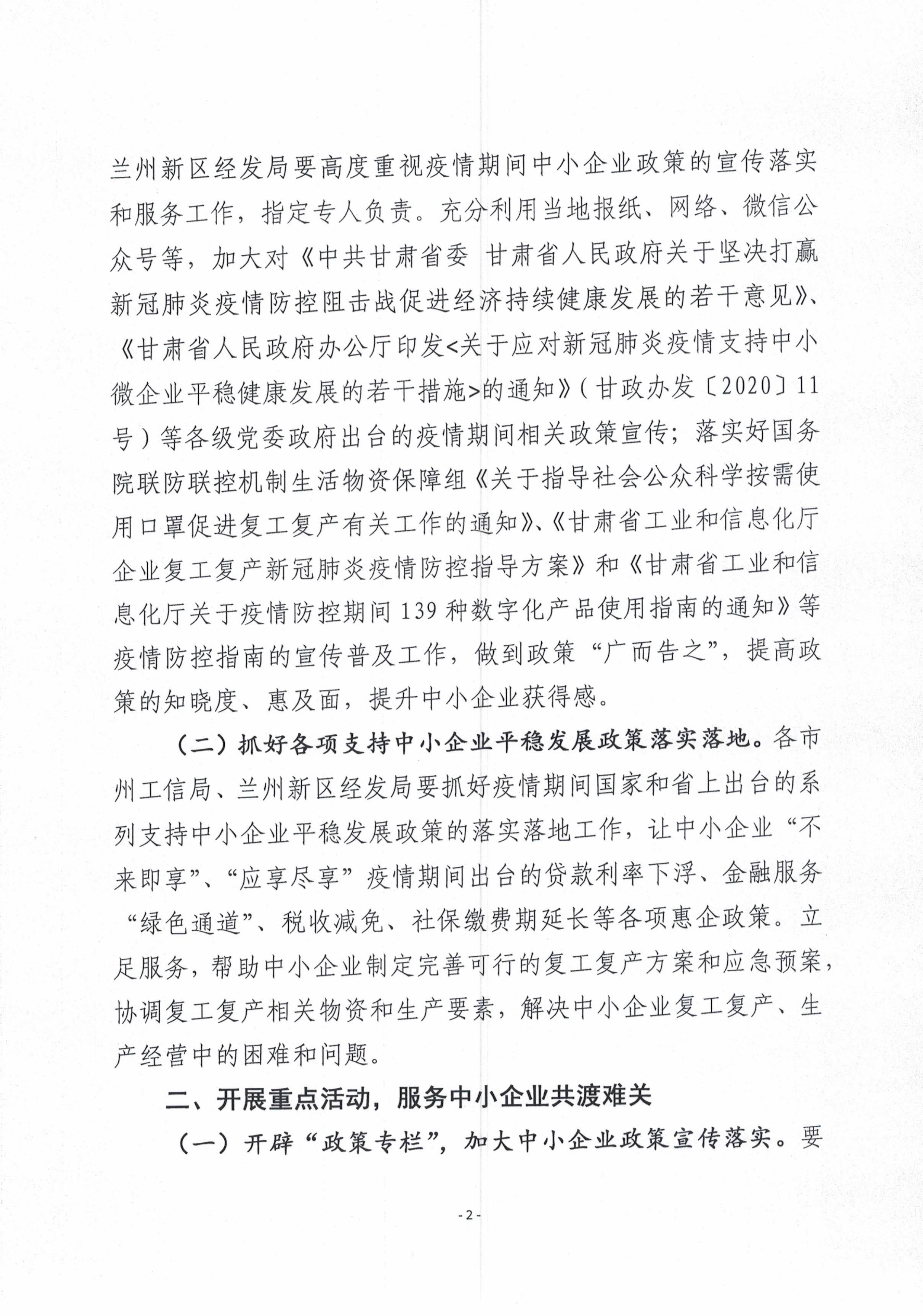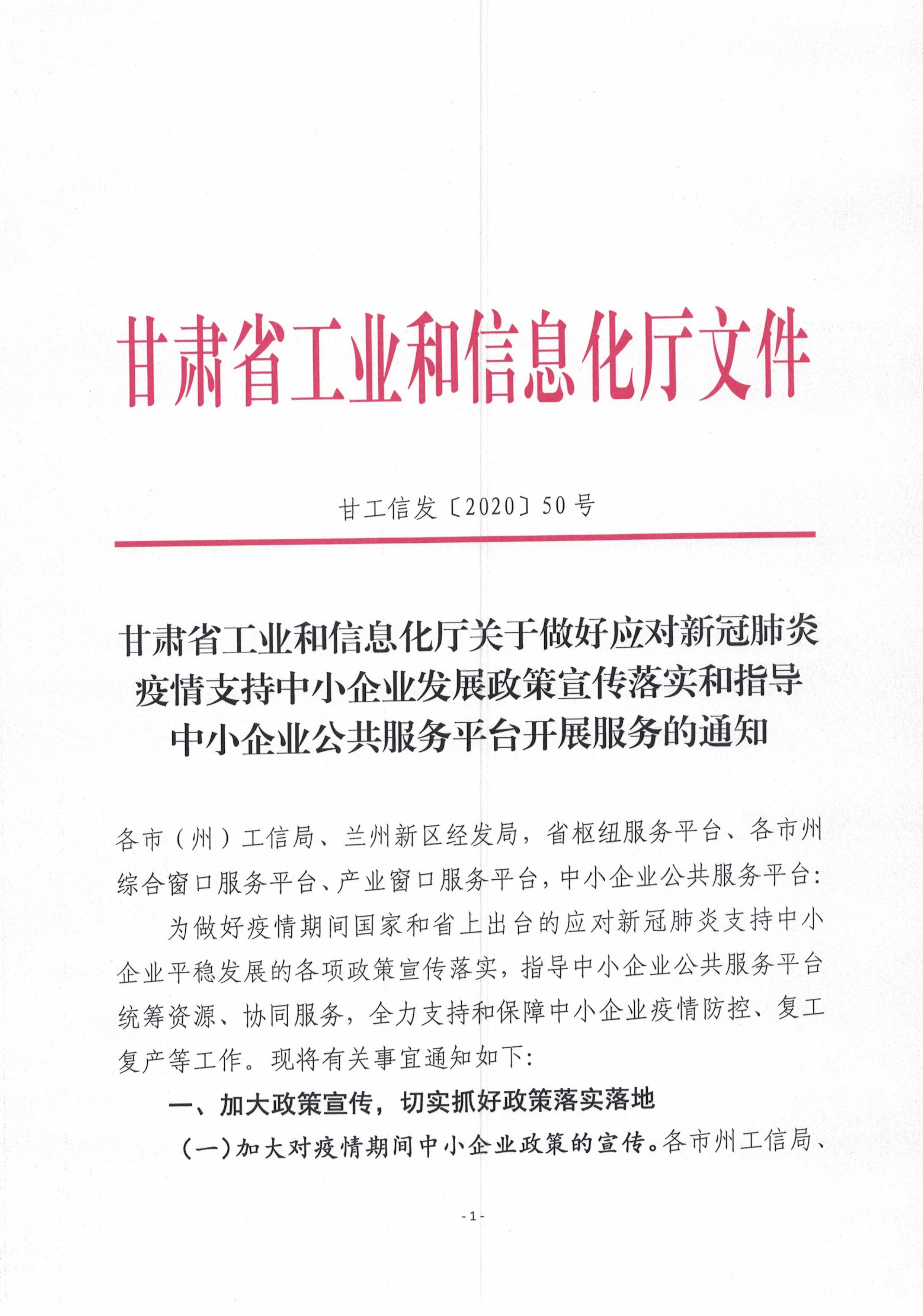 | 甘肅省工信廳關(guān)于做好應(yīng)對新冠肺炎疫情支持中小企業(yè)發(fā)展政策宣傳落實(shí)和指導(dǎo)中小企業(yè)公共服務(wù)平臺開展服務(wù)的通知 |