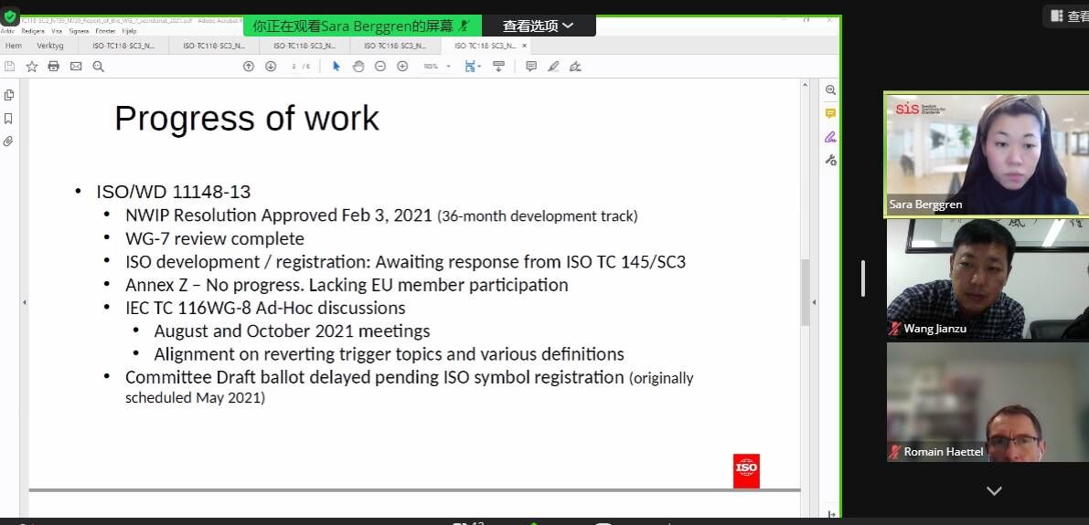 會議由秘書長Sara Berggren女士主持。秘書長Sara Berggren女士對WG3、WG4工作組在研項目進(jìn)展情況和下一步計劃做了闡述、對近年來該組織開展的各項工作向大會做了總結(jié)匯報,大會復(fù)審了6項國際標(biāo)準(zhǔn)并形成了復(fù)審結(jié)果、對2022年至2023年期間需要復(fù)審的標(biāo)準(zhǔn)做了計劃安排。大會聽取了各國專家對國際標(biāo)準(zhǔn)在研項目和下一步計劃安排的意見和建議,形成了大會議程的決議和下一年國際標(biāo)準(zhǔn)化工作計劃的決議。 我所于1978年確定為國際標(biāo)準(zhǔn)化活動的國內(nèi)歸口管理單位,一直以O(shè)成員身份參與國際標(biāo)準(zhǔn)化組織工作,自2017年6月3日后轉(zhuǎn)化為P成員,自本標(biāo)委會行使P成員職責(zé)以來,代表本行業(yè)領(lǐng)域積極參與國際標(biāo)準(zhǔn)組織活動,努力推動中國標(biāo)準(zhǔn)化事業(yè)向國際先進(jìn)水平邁進(jìn),實現(xiàn)中國標(biāo)準(zhǔn)走出去的發(fā)展戰(zhàn)略,提升中國標(biāo)準(zhǔn)在國際舞臺的地位,倡導(dǎo)標(biāo)準(zhǔn)互聯(lián)互通、互相促進(jìn)、共同發(fā)展的目標(biāo),引領(lǐng)和指導(dǎo)本行業(yè)標(biāo)準(zhǔn)化工作與國際接軌的進(jìn)程,實現(xiàn)標(biāo)準(zhǔn)化事業(yè)高水平、高質(zhì)量、健康持續(xù)的發(fā)展。