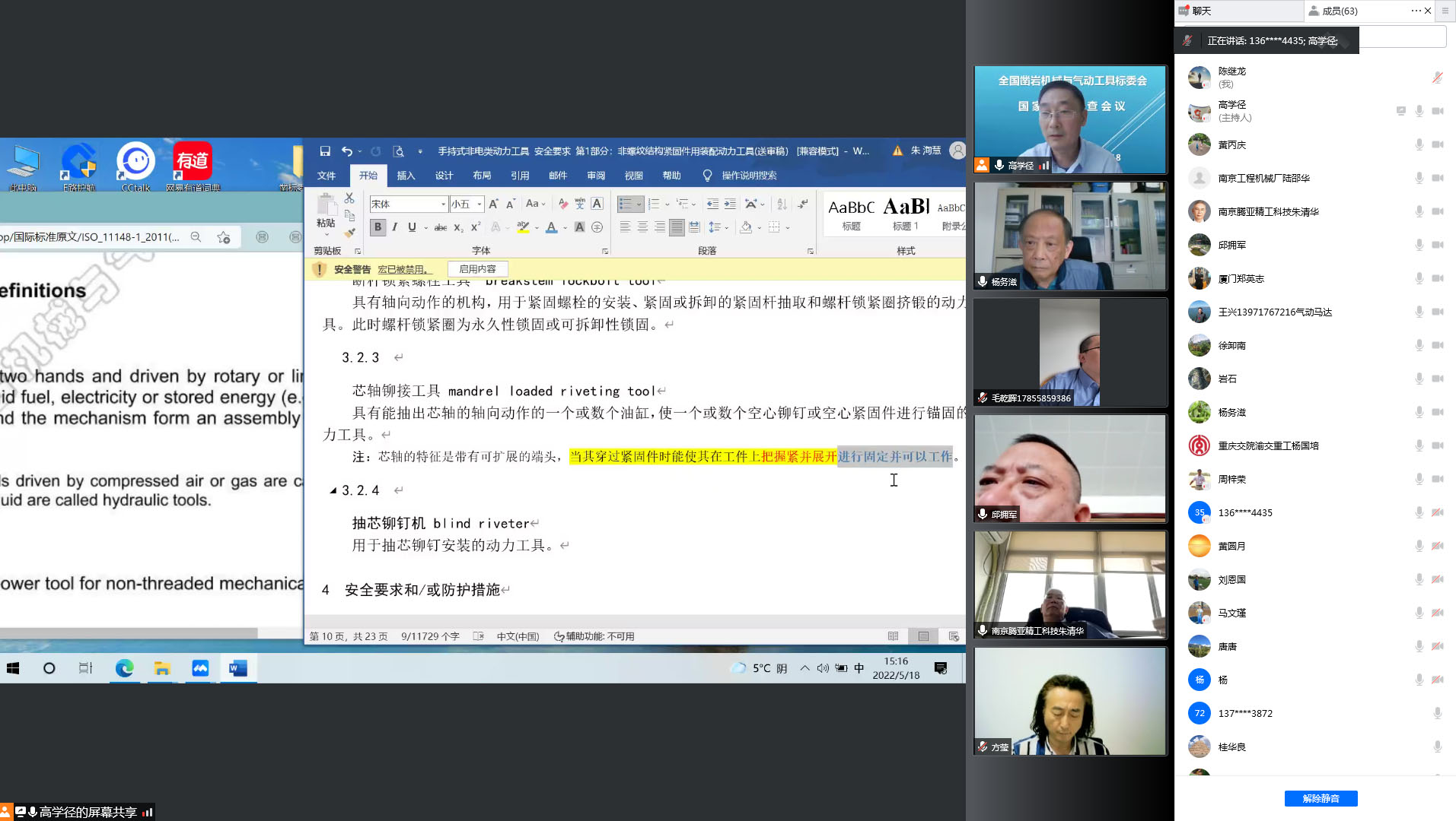 全國鑿巖機械與氣動工具標委會(以下簡稱鑿標委)標準審查會議于2022年5月18日在線上召開。 由于國內(nèi)疫情形勢嚴峻,原定于2021年11月5-8日召開的七屆一次年會暨標準審查會遲遲不能舉行,為了保證國家標準項目的如期正常進行,鑿標委秘書處與標委會委員及行業(yè)同仁商議后,決定以“騰訊會議”線上的形式,召開標準審查會。 本次標準審查會共有63名鑿標委委員、觀察員以及來自行業(yè)的專家和企業(yè)代表參加。