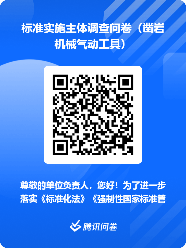各相關(guān)單位負(fù)責(zé)人,您好! 天水鑿巖機(jī)械氣動(dòng)工具研究所作為全國(guó)鑿巖機(jī)械與氣動(dòng)工具標(biāo)準(zhǔn)化技術(shù)委員會(huì)秘書(shū)處掛靠單位,現(xiàn)受工業(yè)和信息化部相關(guān)工作安排,組織開(kāi)展對(duì)強(qiáng)制性國(guó)家標(biāo)準(zhǔn)GB 17957-2021《鑿巖機(jī)械與氣動(dòng)工具 安全要求》的實(shí)施現(xiàn)狀調(diào)研。 本次調(diào)研旨在貫徹落實(shí)《標(biāo)準(zhǔn)化法》及《強(qiáng)制性國(guó)家標(biāo)準(zhǔn)管理辦法》要求,全面評(píng)估該標(biāo)準(zhǔn)在行業(yè)的實(shí)際應(yīng)用效果,以便未來(lái)進(jìn)一步提升標(biāo)準(zhǔn)質(zhì)量,更好地服務(wù)行業(yè)發(fā)展。 您的真實(shí)反饋是本次評(píng)估的核心依據(jù)。誠(chéng)邀貴單位填寫(xiě)問(wèn)卷,分享標(biāo)準(zhǔn)實(shí)施的實(shí)際情況。您可掃描以下二維碼填寫(xiě)問(wèn)卷或?qū)⒄{(diào)查問(wèn)卷直接反饋至秘書(shū)處,郵箱地址為TC173@163.com。 感謝您的大力支持!